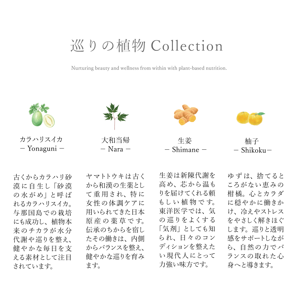 A.「カラハリスイカ・大和当帰・しょうが・ゆず」それぞれの植物素材が持つチカラを活かしながら、“冷え・ゆらぎ・代謝・リズム”など、現代人が感じやすい不調に多角的にアプローチするために選ばれました。漢方の知恵と現代植物研究を融合。相乗効果で、カラダ本来のめぐる力をやさしく引き出します。