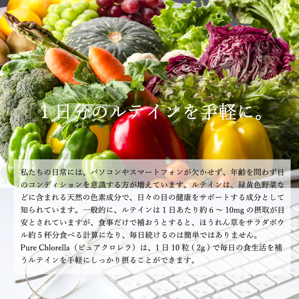 私たちの日常には、パソコンやスマートフォンが欠かせず、年齢を問わず目のコンディションを意識する方が増えています。ルテインは、緑黄色野菜などに含まれる天然の色素成分で、日々の目の健康をサポートする成分として知られています。一般的に、ルテインは1日あたり約6~10mgの摂取が目安とされていますが、食事だけで補おうとすると、ほうれん草をサラダボウル約5杯分食べる計算になり、毎日続けるのは簡単ではありません。Pure Chlorella(ピュアクロレラ)は、1日10粒( 2g )で毎日の食生活を補うルテインを手軽にしっかり摂ることができます。