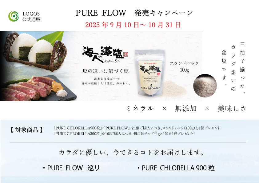 「 ピュアクロレラ900粒」1袋ご購入につき、海人の藻塩スタンドパック(100g)を1個プレゼント!