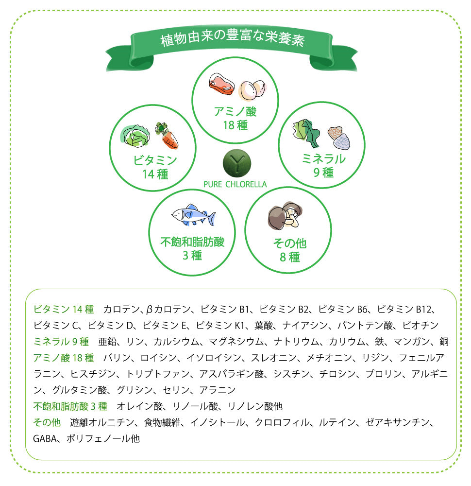 ホールフードとは、直訳すると「Whole(まるごと)」の「Food(たべもの)」全体食から生まれた言葉です。健康を保つには生命あるものの全体を食べることで必要な成分が過不足なく吸収できるということです。魚は頭、内臓、骨、野菜は皮や葉、種なども含め普段捨ててしまっている部分にこそ栄養豊富であることから、ひとつの食材を丸ごと食べるホールフード(一物全体食)が、健康に良いという考えです。クロレラは小さな単細胞の生命体で、天然の栄養バランスそのままに丸ごと全部摂取することができる理想的な食品です。